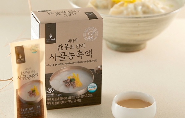 The Nenia Korean Beef Bone Concentrate is made using only two ingredients: Korean beef bones and bamboo salt. It is prepared with domestic antibiotic-free beef bones, simmered for over seven hours using a high-temperature double-boiling method, resulting in a rich, milky broth.